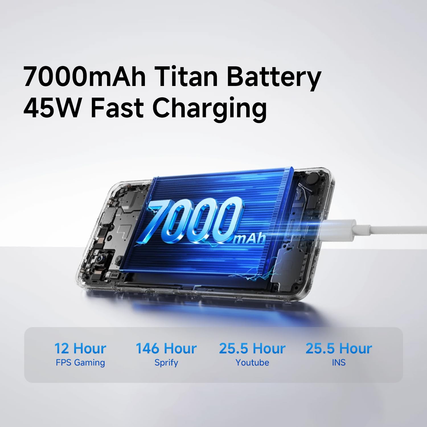 Special features ‎144Hz 1000nits Sunlight Display, 45W Ultra Charge, 7000mAh Titan Battery, Dimensity 7400 Ultra 5G Chipset